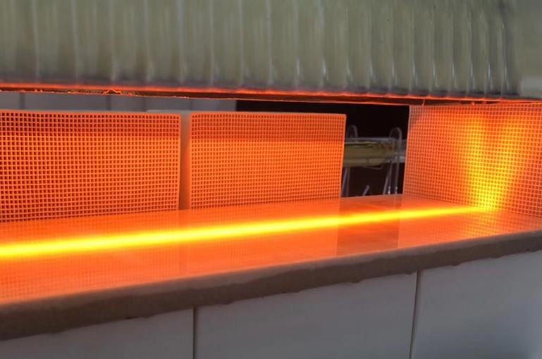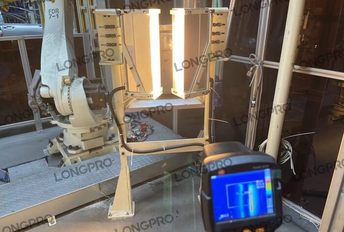 在待折彎的熱塑性預(yù)浸料板上進(jìn)行紅外線快速預(yù)熱軟化,雙面加熱,以達(dá)到折彎所需工藝要求。利用線型聚焦加熱器(加熱器聚集成一條高溫加熱線)的低能耗,高光強(qiáng),穿透力強(qiáng),控制簡單等特點(diǎn),通過上下布置,快速精準(zhǔn)軟化所需的狹長區(qū)域,尤其帶有厚度的預(yù)浸料折彎加工。